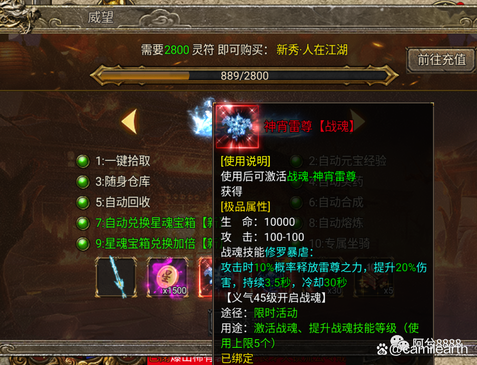 当然,为了平衡技能的能力,激活技能还有一个冷却时间,为30秒。战魂神宵雷尊的这一强大技能,使得它成为了许多玩家梦寐以求的战魂之一。而获得战魂神宵雷尊并不容易,因为它只能通过限时活动获得。在一般的游戏活动期间,玩家们会看到一些与战魂神宵雷尊相关的任务或者充值活动。通过完成这些任务或者满足一定的充值条件,玩家们便有机会获得战魂神宵雷尊的碎片,甚至是直接获取整个战魂。
